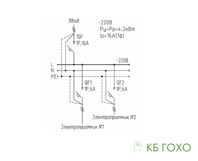 Вводной АВ номиналом 16 А, отходящие две линии по 6А.