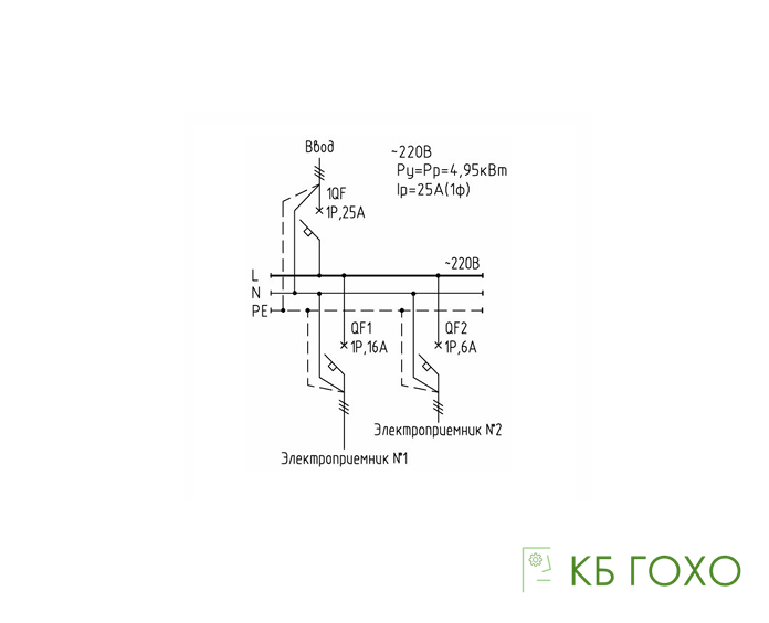 Вводной АВ номиналом 25 А, отходящие линии 16A и 6A.