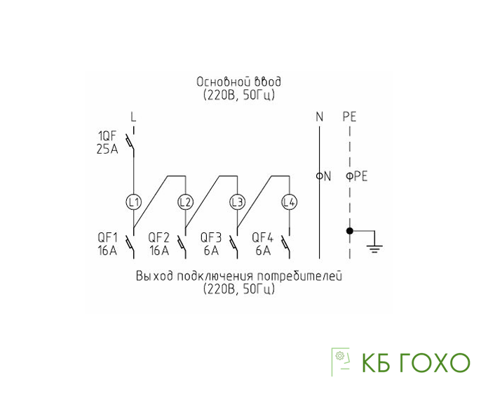Вводной АВ номиналом 40 А, отходящие четыре линии по 2x16A и 2x6A.