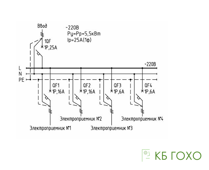 Вводной АВ номиналом 40 А, отходящие четыре линии по 2x16A и 2x6A.